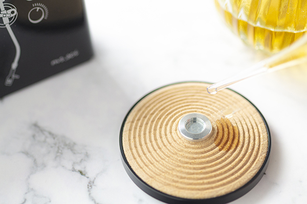 圓形櫸木轉盤為磁力吸附,可直接取下添加香味於轉盤背面木頭處,