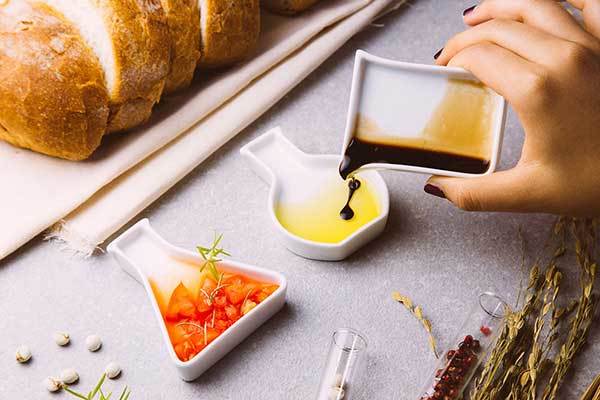 此外,蘸入辣油或油醋時,不同材質造成的油水分層在食驗醬料碟上呈現有趣的現象。