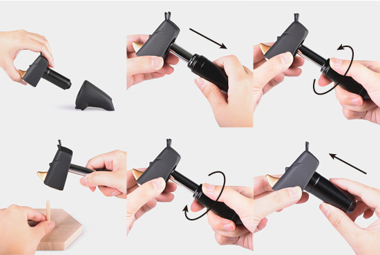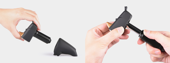 使用時將犀牛頭部拔出,隱藏式握把延伸的設計更符合人因操作,
