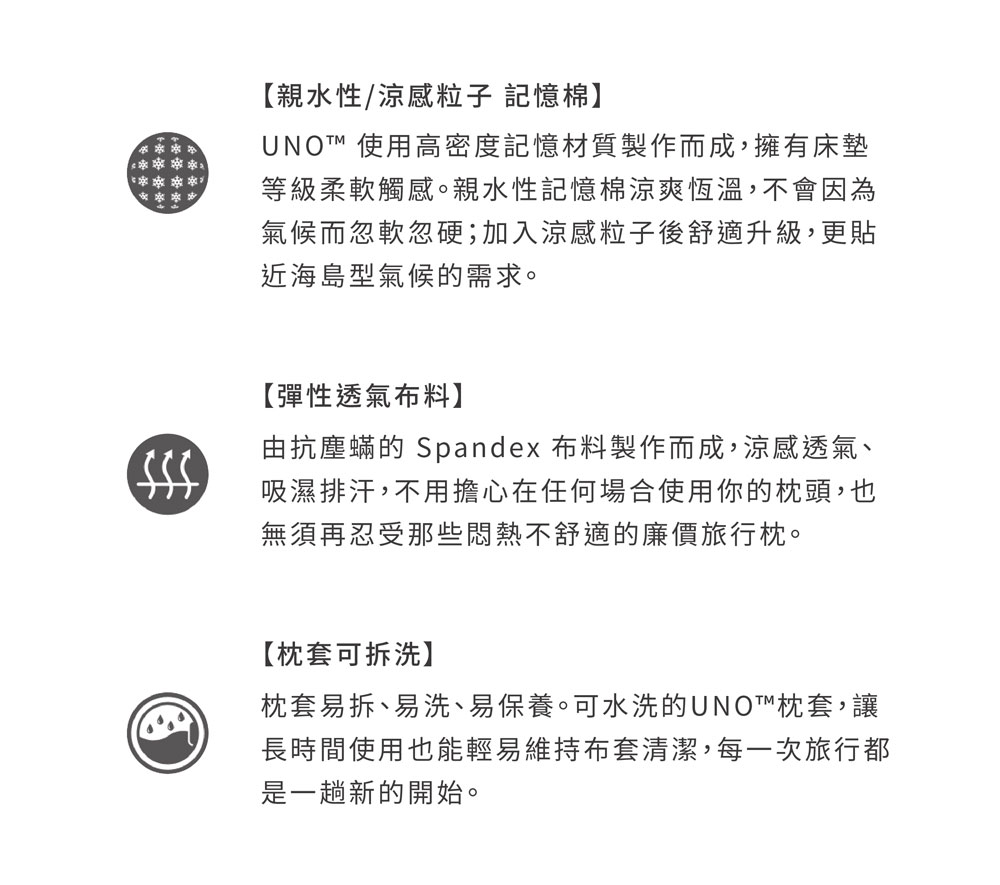 | 簡潔俐落的UNO™ 內外兼修 80kg/m3 兩倍密度 支撐加倍,UNO™ 使用高於市面一倍的記憶棉密度,不僅如此,UNO™ 獨家的記憶眠配方,讓頸枕軟硬度適中,更釋壓、更舒壓。