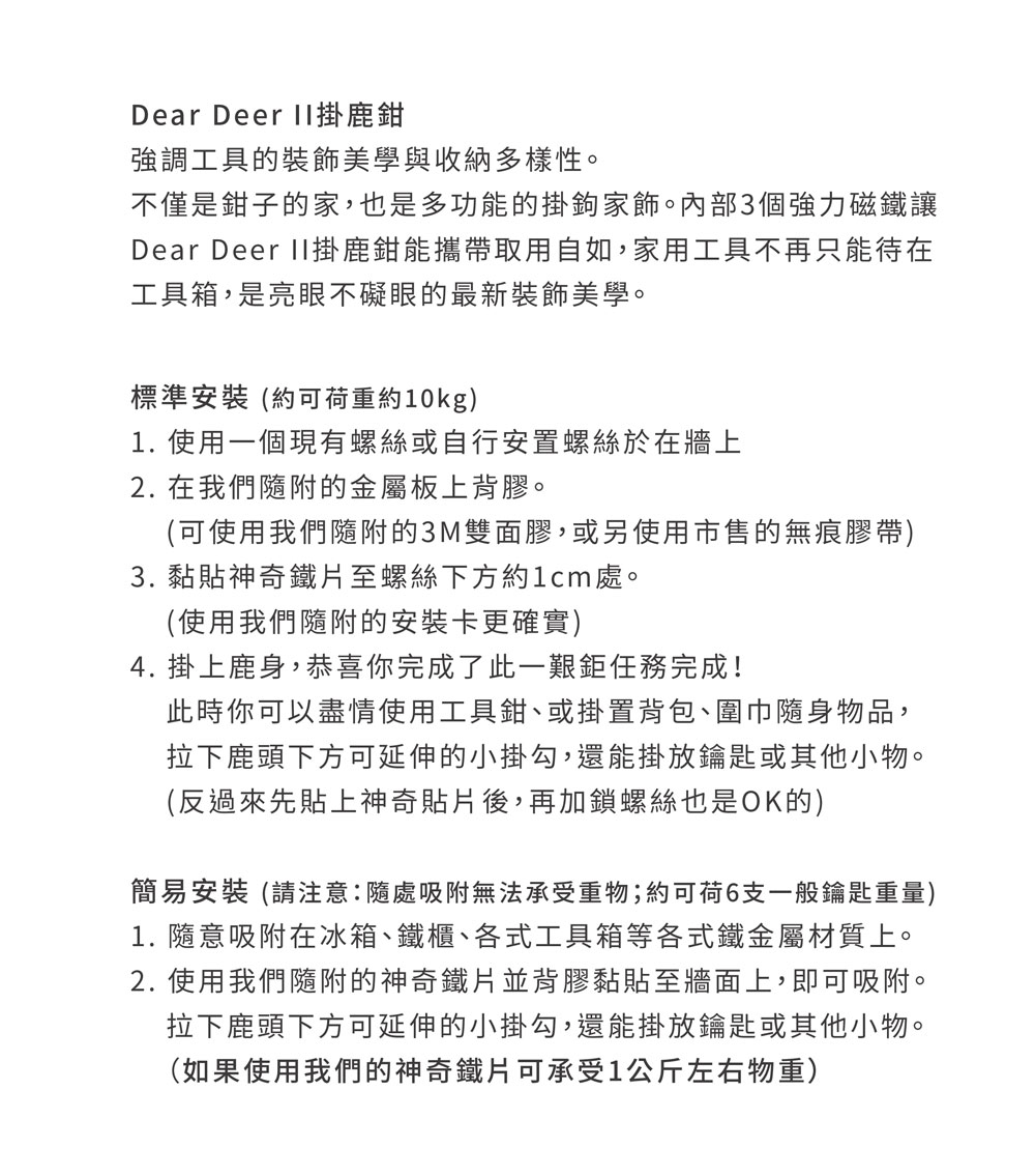 | Dear Deer II正式成為牆上工具家飾品,提升擺設質感,同時增加工具取用的方便性,以低調的金屬色調呈現,為屋內增添一分穩定感,更是現代、工業風裝潢的最佳選擇 |