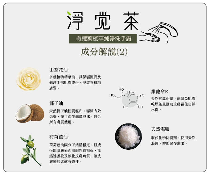 運用高科技將一顆顆純淨天然的茶籽中萃取出「茶籽酵素」,天然茶皂素潔淨去汙效果佳,含「茶鹼」除臭制菌,另添加美國有機USDA認證有機橄欖葉萃取菁華 + 檸檬草 + 綠茶多種植物萃取成份,茶籽中富含「茶籽菁華油」成份,讓您潔淨雙手後保濕不乾澀更可滋養保護您的雙手。