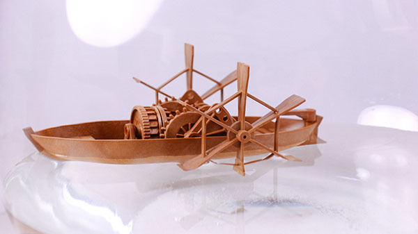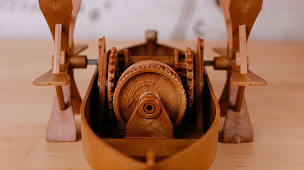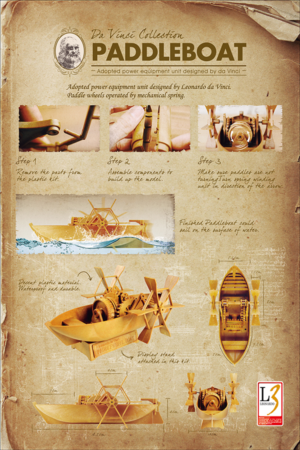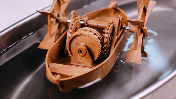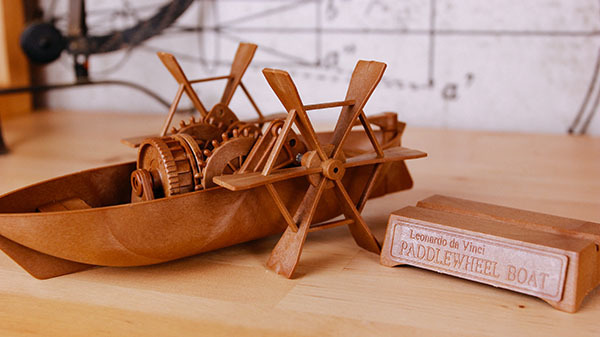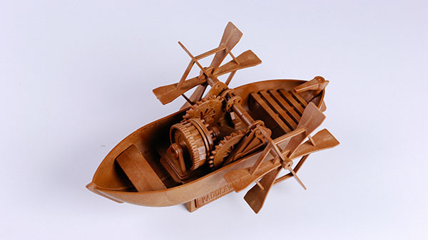 達文西設想了一種不依賴船帆的小型船隻,其前進的動力是來自於兩側的槳輪,