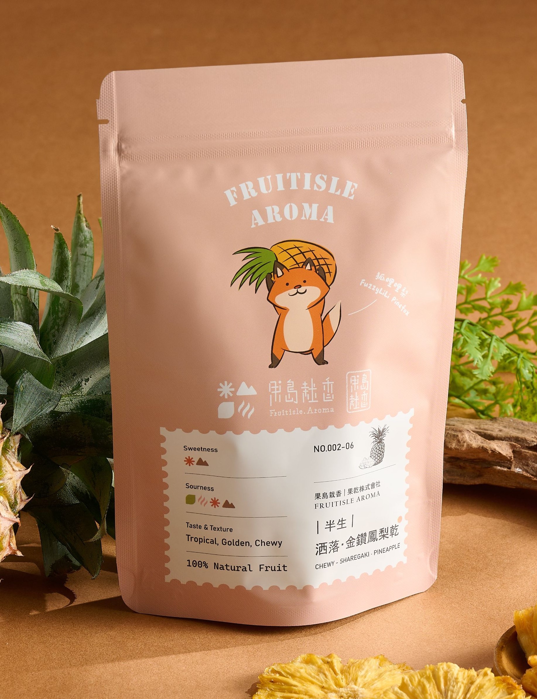 採用台灣金鑽鳳梨低溫烘焙而成的半生鳳梨乾,保留水果本身營養纖維,鳳梨本身獨特的鳳梨酵素,可以分解蛋白、幫助消化,堅持採用如「陽光灑落的顏色」為摘採標準,每一塊三角形都是用心的滋味。