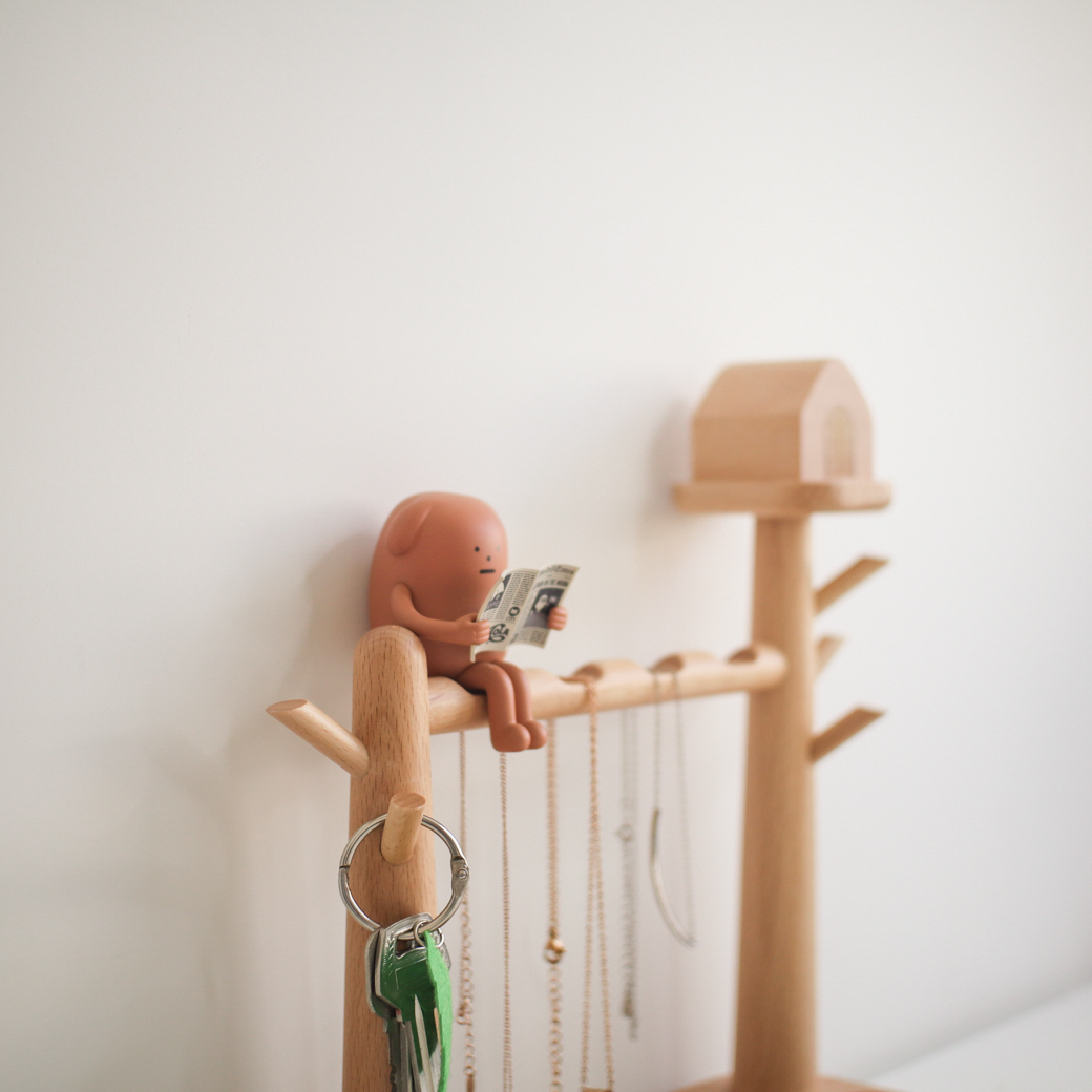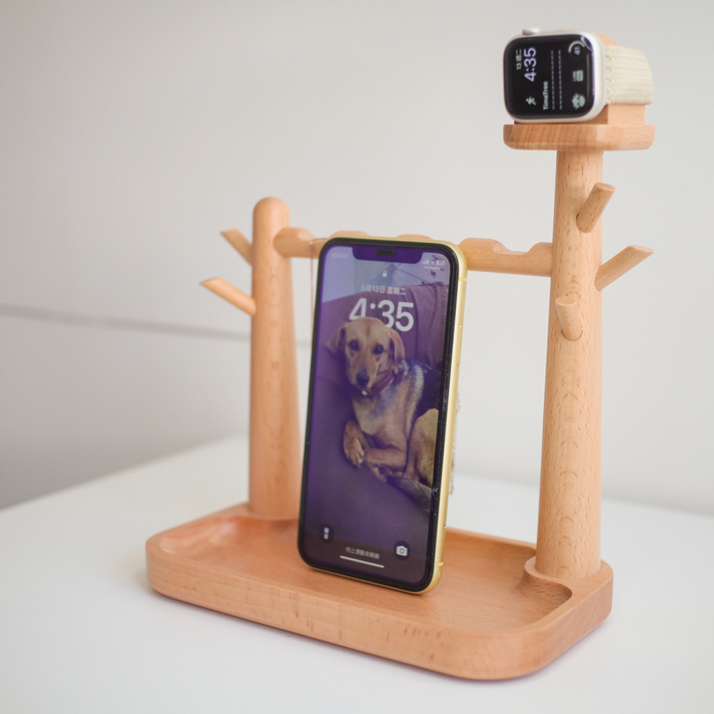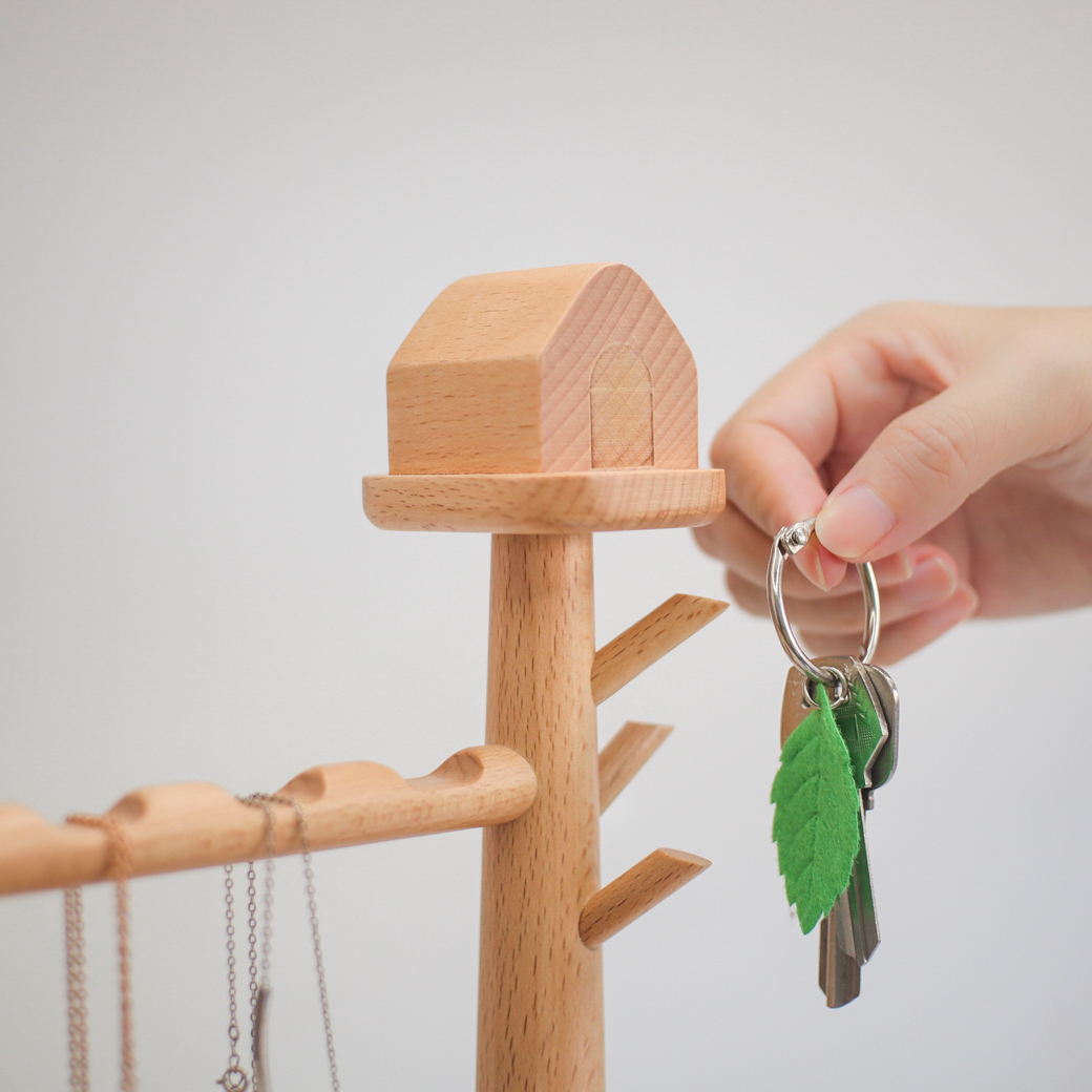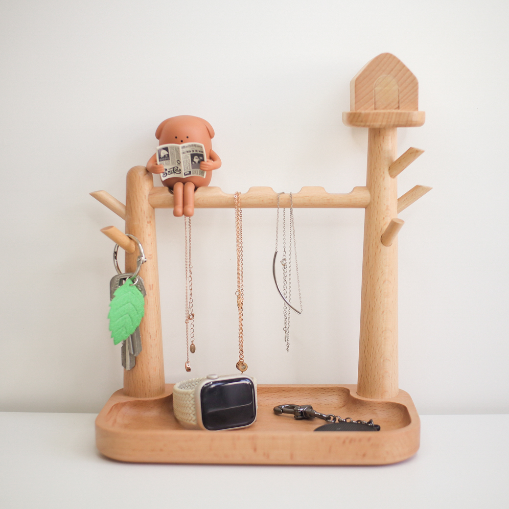 枝條可吊掛鑰匙與飾品,木盤收納日常小物,頂端平台則延伸為手錶置放區
