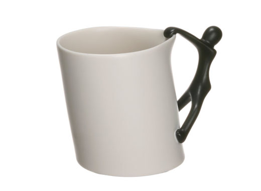 在黑與白的兩色中,杯把的人兒正努力地想把杯子扶正,